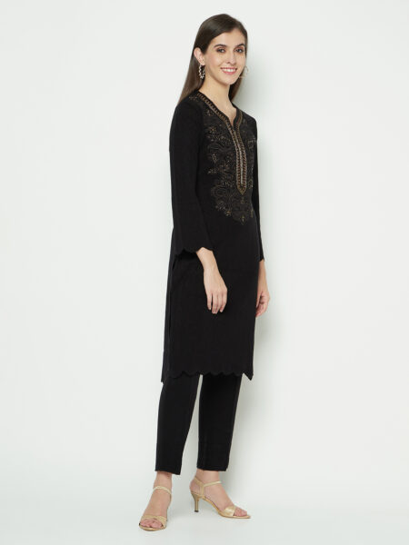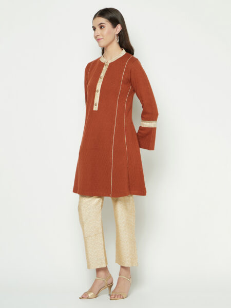 This chic short-length kurta and pant set effortlessly combines modern style with classic elegance. The kurta showcases a sophisticated design with a front panel adorned with intricate center detailing and buttons. The mandarin collar adds a touch of grace, while the matching knitted pants provide a sleek and polished fit.
