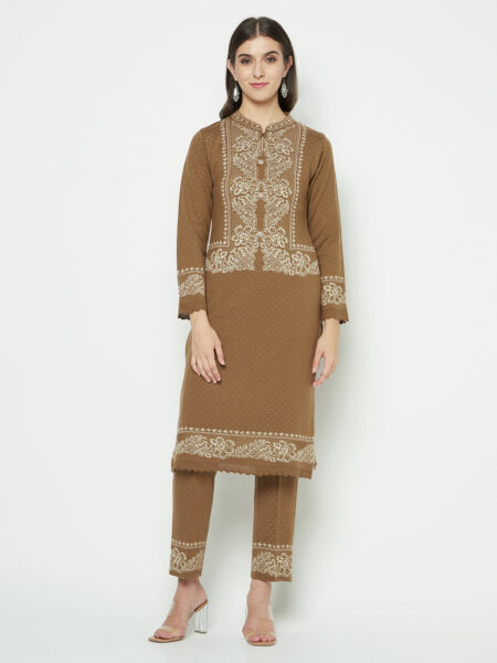 Unveil the dreamy elegance of the Sienna Dreams kurti set from Knit Studio. The enchanting brown tones intermingle in a dual-tone embrace, reminiscent of sunsets over an open horizon. Its full-length charm is as versatile as the changing seasons, making it a wardrobe essential.