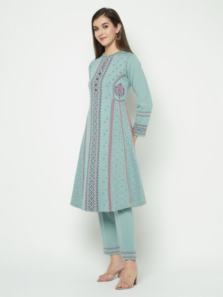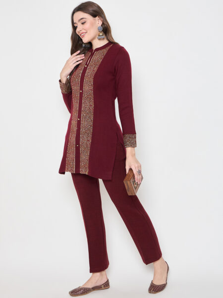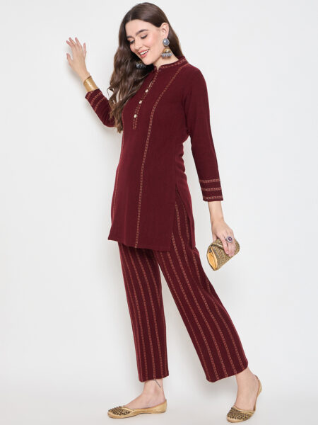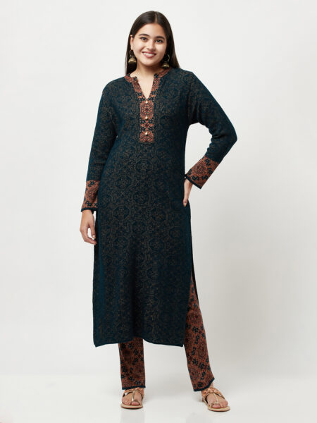 Make your winter journey beautiful with is knitstudio’s kurti-set that comes with straight pants and intricate ethnic pattern and contrasting color is perfect to wear on formal as well as semi-formal occasions.