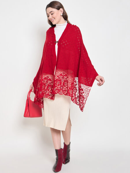 A sophisticated knitted Stole with beautiful floral thread work on a delicate net base, featuring a discreet hook for versatile styling. Elegant and lightweight for any occasion.