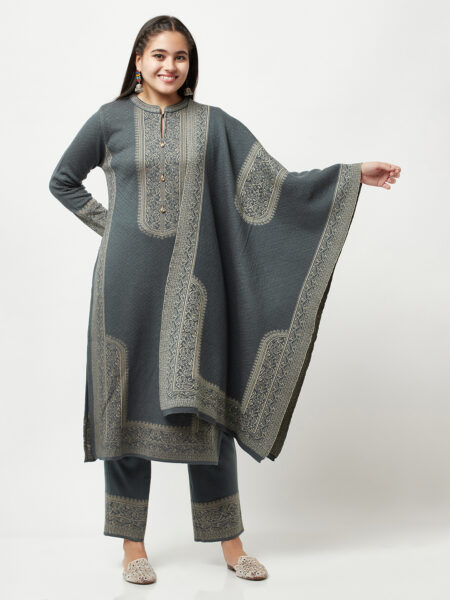 Look like an absolute stunner this festive season with this elegant and sophisticated three-piece kurti set. This set comprises a kurti with full length sleeves and an ethnic detailed round mandarin collar-neckline with an ankle-length bottom with a ethnic border detail at the hemline and a knitted stole with ethnic pattern.