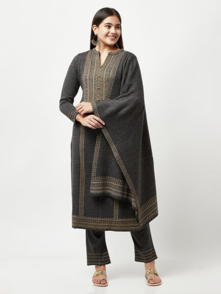 Flaunt your style in this contemporary Kurta Set. The Set Includes straight fit long kurti with Mandarin Collar And Features ethnic design On Yoke. Coordinated With straight fil Pants striped pattern on the hem. And Tailored In Comfort Fit ethnic pointelled knitted stole.